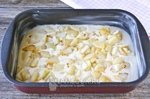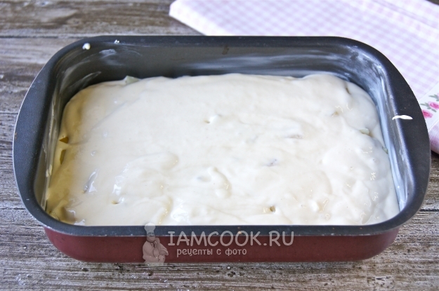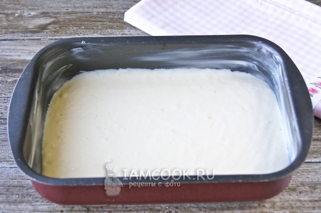 Форму для выпечки смазала сливочным маслом, вылила половину теста.