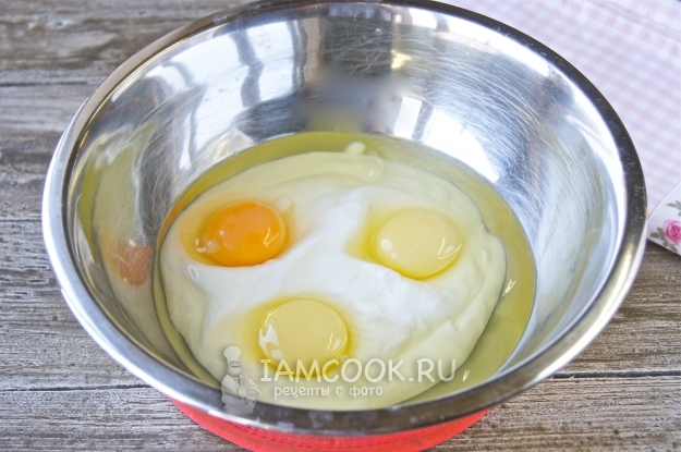 В миску вылила сметану, вбила яйца и хорошенько взболтала венчиком.