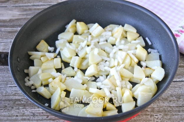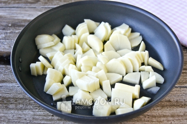 Для начала вымыла и очистила картофель, нарезала на небольшие кусочки, помешивая, обжарила на сковороде с растительным маслом до полуготовности на среднем огне.