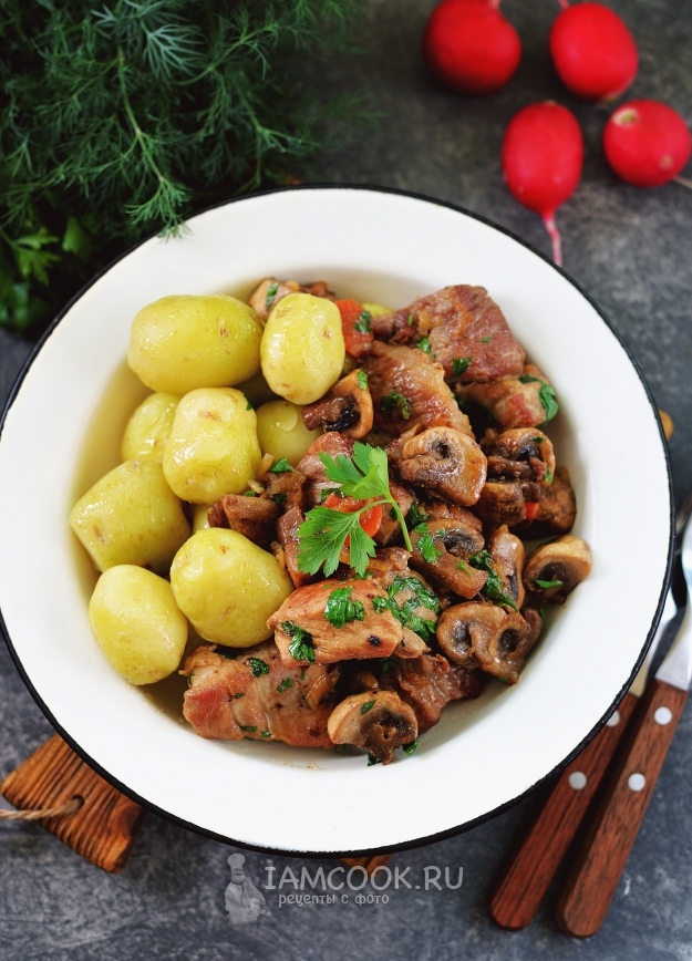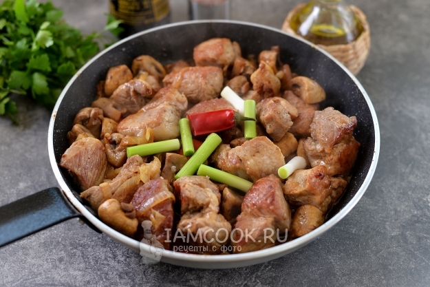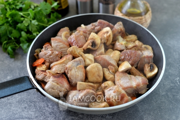 Когда лук станет прозрачным, положите в сковороду крупно нарезанные грибы, сделайте тише огонь. Обжаривайте мясо с овощами минут 10-15.