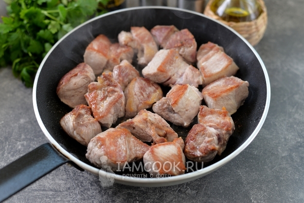 Влейте чуть постного масла на разогретую сковороду, выложите в него нарезанную крупными кусками свиную шею, обжарьте до румяного цвета. За счет жирка шейка сразу же приобретает красивый золотистый цвет.
