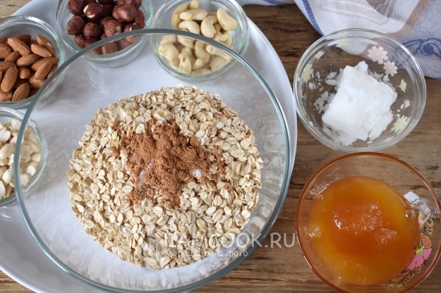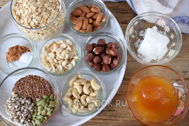 Подготовим ингредиенты: орехи и семена можно выбирать по вкусу, а вот геркулес понадобится тот, который предназначен для долгой варки (15-20 минут). Если в запасе нет кокосового масла, замените его на подсолнечное без запаха.