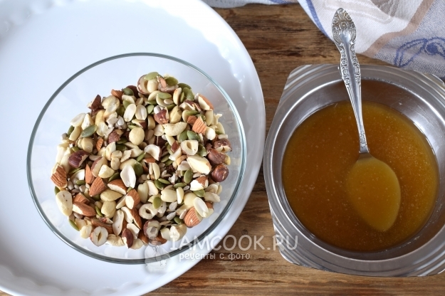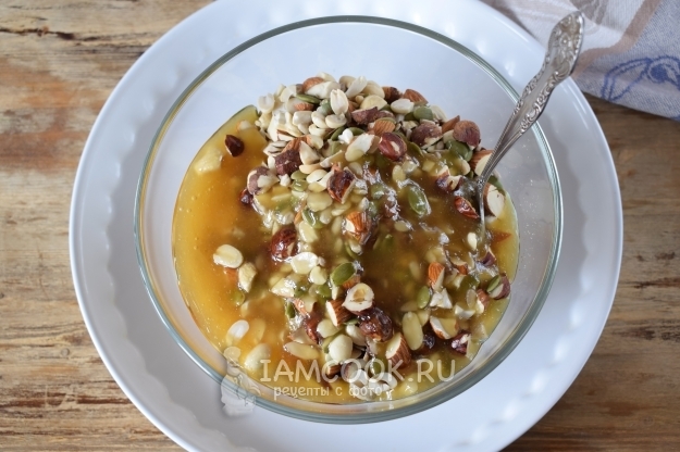 В миску с геркулесом добавим ореховую смесь и сироп из меда и масла.