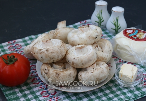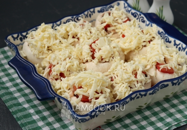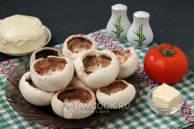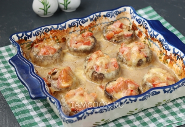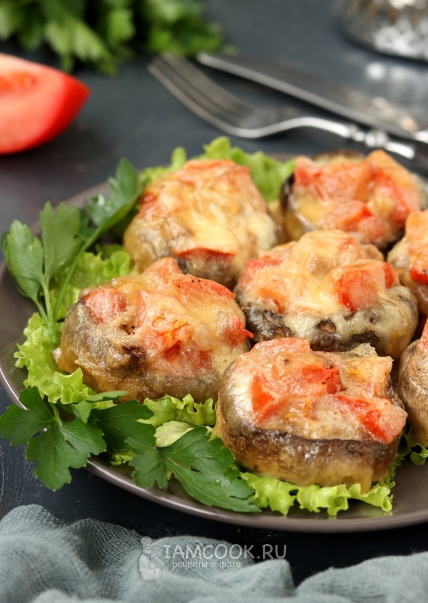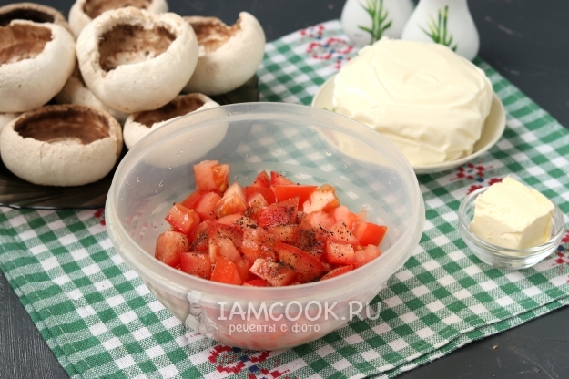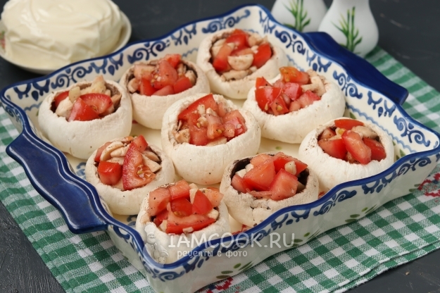 Ножки грибов мелко нарезать и перемешать с помидором. Выложить начинку внутрь каждой шляпки. Форму для запекания смазать сливочным маслом и поместить в неё нафаршированные грибы.