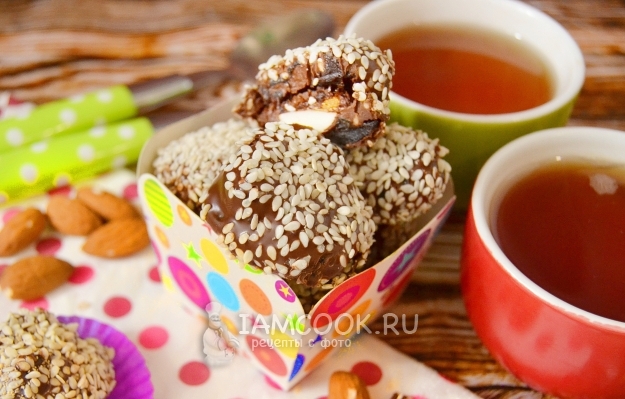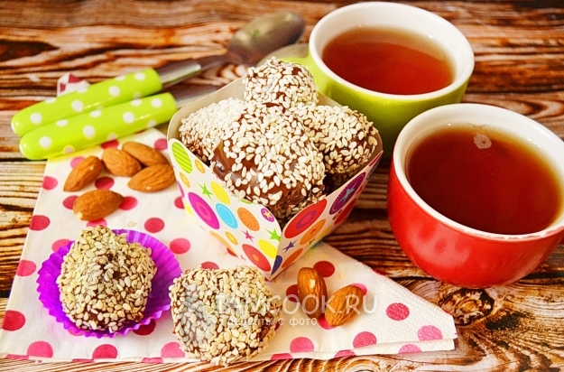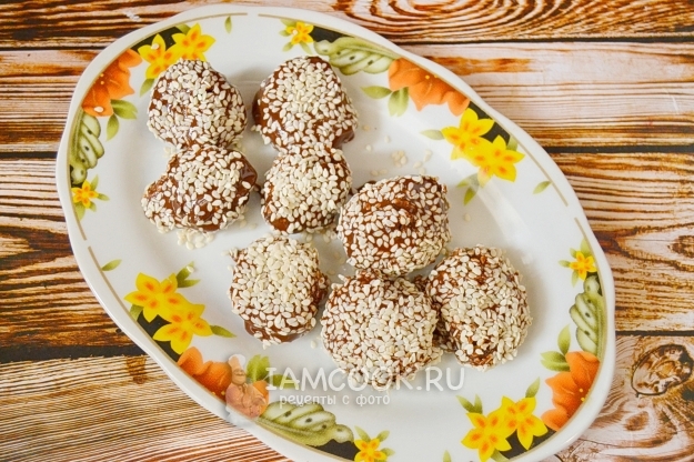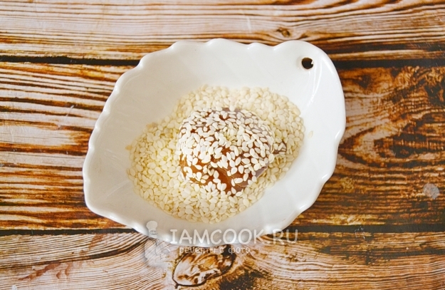 Искупаем каждый плод в шоколаде, затем выложим в кунжут. Обсыпем кунжутом.