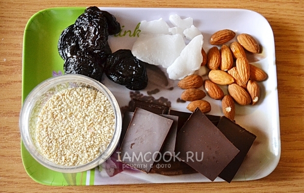 В шоколадную массу выложим чернослив, начиненный миндалем.