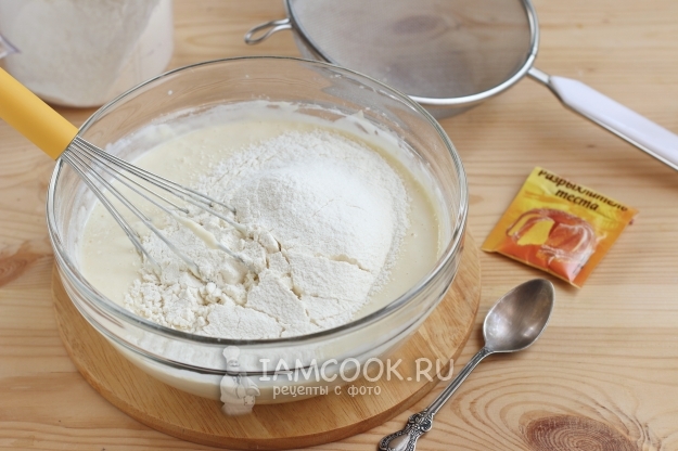 В два захода просеем в миску муку с разрыхлителем. Смотрим по консистенции теста, оно должно быть похоже на жидкую сметану. Возможно, муки понадобится чуть меньше.