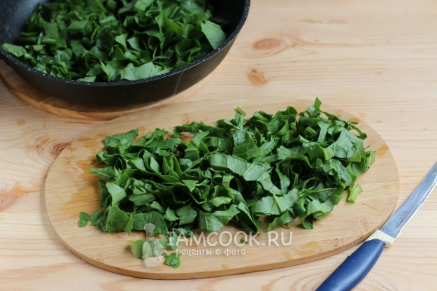 В первую очередь приготовим начинку. Помоем шпинат, стряхнем воду и нарежем его произвольно, складывая затем в сковороду.