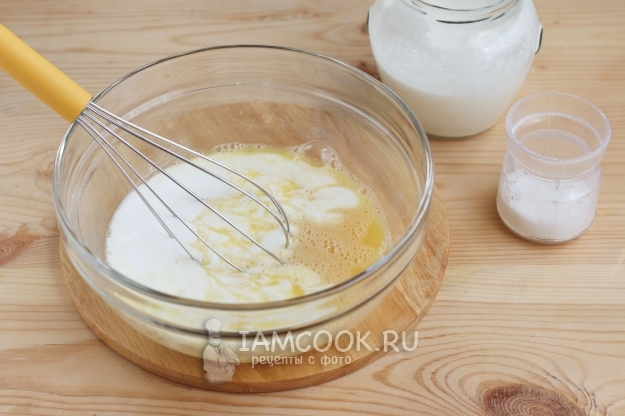 Не забудем заранее разогреть духовку до 180 градусов. Когда начинка будет готова, быстро сделаем тесто. Смешаем кефир, яйца и соль венчиком.