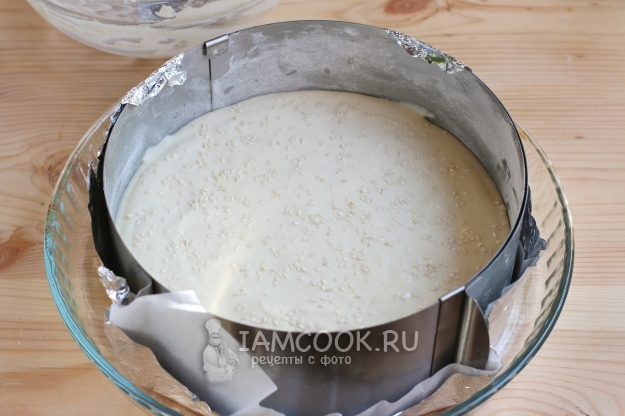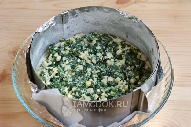 Поверх начинки выливаем остальное тесто и отправляем форму в разогретую духовку. Выпекается заливной пирог со шпинатом примерно 30-40 минут, в зависимости от конкретной духовки. Кстати, тесто можно присыпать кунжутными семенами, если есть, но это уже по вашему желанию.