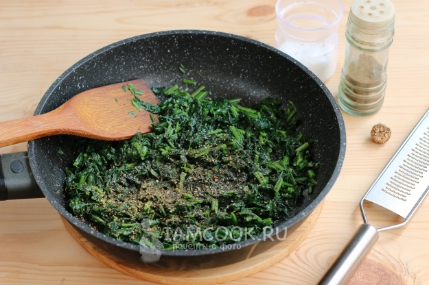 Нарезанный шпинат обжарим в сковороде на сливочном масле до полного выпаривания жидкости, приправим шпинат солью, перцем и мускатным орехом. Готовый шпинат немного остудим.