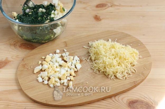 Отваренные яйца нарежем кубиком и натрем на терке сыр. Смешаем с готовым шпинатом.