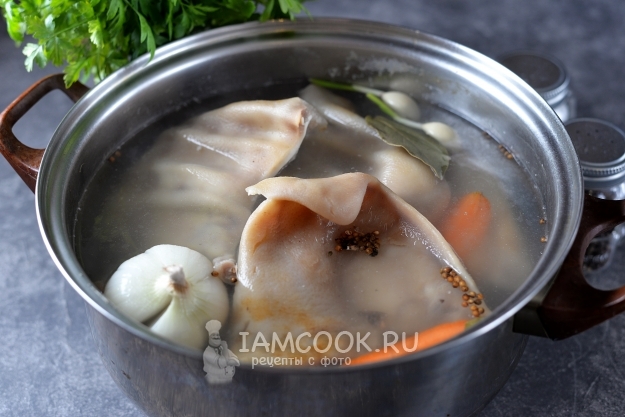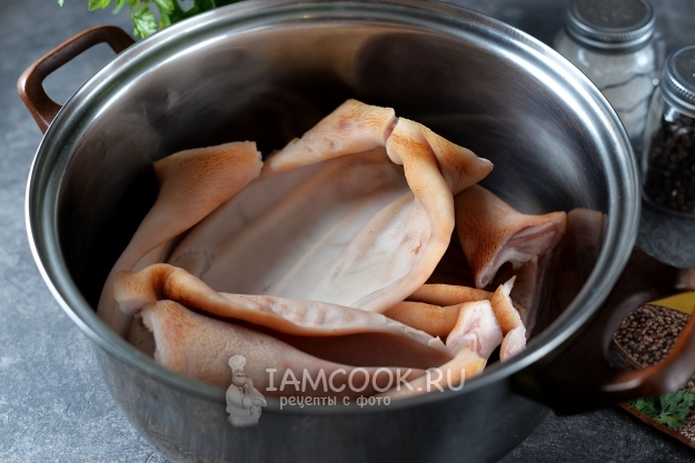 Переложите ушки в глубокую кастрюлю, залейте большим количеством воды. Как только вода закипит, проварите уши минут 5, слейте первую воду, уши зачистите еще раз.