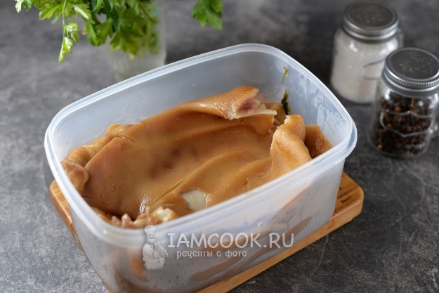 Дальше я переложила уши в маленький контейнер, сверху установила груз и поставила в холодильник на ночь, они очень хорошо застыли.