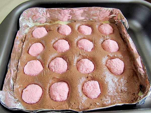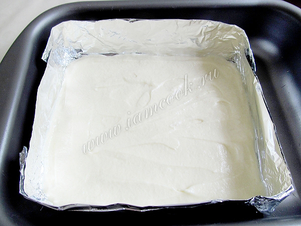 В форму выложите белую часть теста. Распределите по всей поверхности. Я сделала импровизированную форму из фольги, так как, моя была больше по размеру, чем мне было нужно.