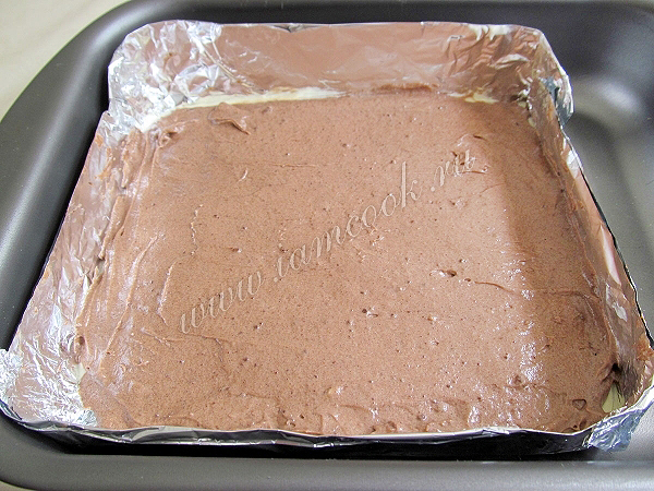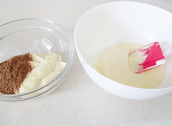 Полученную смесь разделите на две части и в одну из них добавьте какао и молоко. Вместо молока можно взять сливки, результат будет лучше.