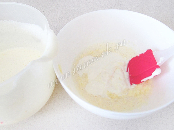 Взбитые яйца постепенно (по ложке) добавляйте к масляной смеси и размешивайте венчиком до однородной и пышной массы. Добавьте сметану. Затем введите просеянную муку с ванилином и разрыхлителем.