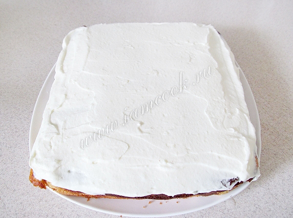 Готовый пирог полностью остудите и покройте кремом. Крем может быть любым, по вашему вкусу- заварным, масляным, со сгущенкой ... Я просто взбила сливки.