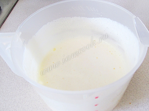 Тем временем, взбейте яйца с белком и частью сахара до пышной массы.