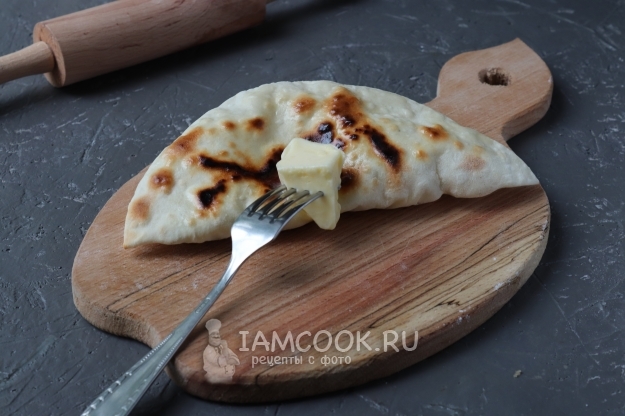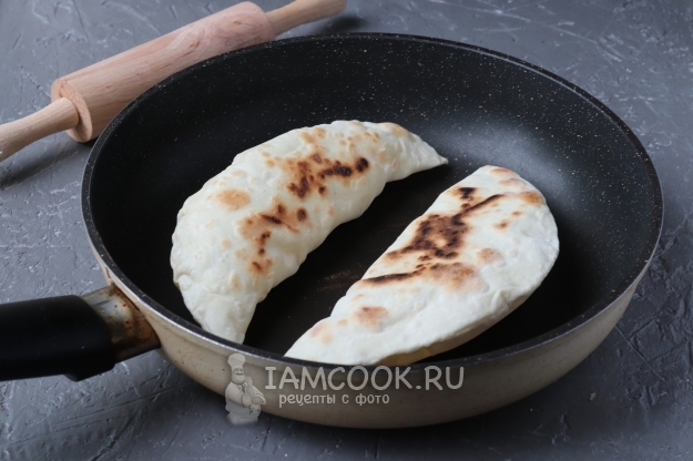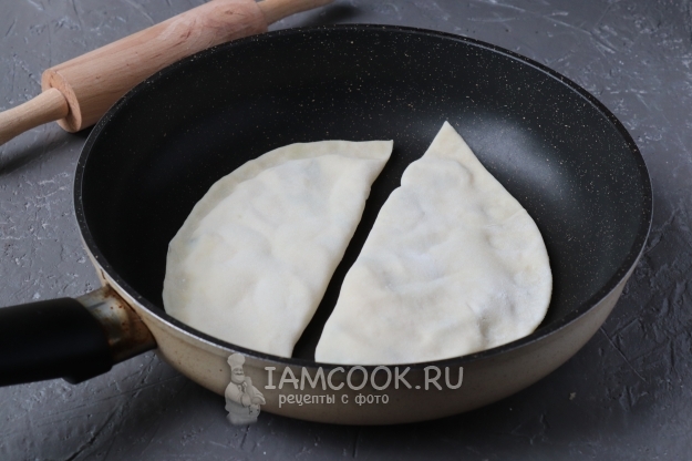 Сложить тесто пополам, по краю пройтись кончиками пальцев, соединяя их между собою. Затем с помощью ножа обрезать лишнее тесто, формируя тонкую лепёшку в форме полумесяца.