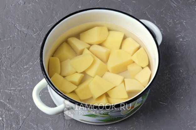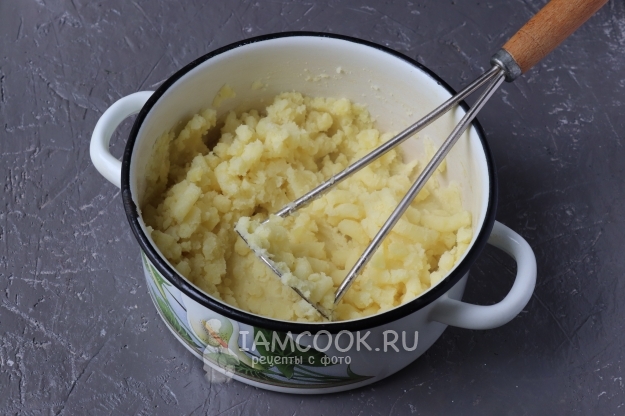 Лишнюю воду слить, а картофель растолочь в пюре.
