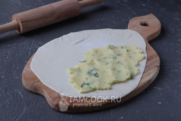 "Отдохнувшее" тесто разделить на 6-7 равных частей, каждую из которых раскатать в тонкий пласт. Затем на одну сторону заготовки выложить начинку (как на фото), стараясь оставить края пустыми.