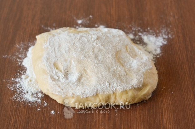 Тесто распределите на хорошо посыпанной мукой рабочей поверхности. Само тесто посыпьте мукой тоже.