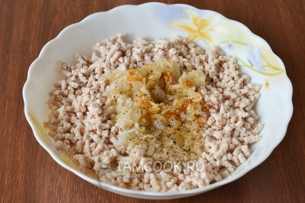 В фарш добавьте оставшийся от яйца белок, жаренный на растительном масле репчатый лук, соль и молотый перец.