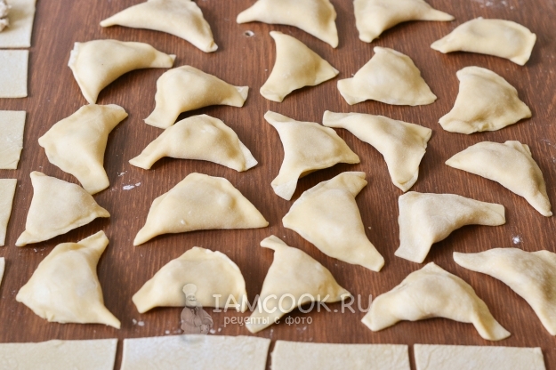 Противоположные края квадратов слепите в треугольные пельмени. Хорошо соедините боковые части.