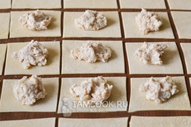 Разделите тесто на множество квадратов размером примерно 6x6 см. В серединку каждой заготовки положите чайную ложку куриной начинки.