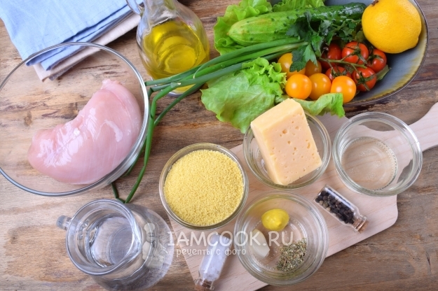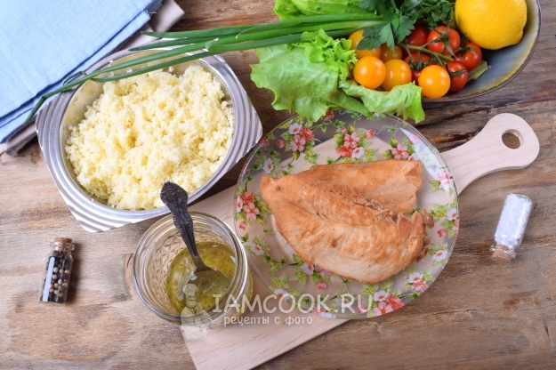 Сухой кускус пересыплем в миску, добавим немного соли и черного перца. Вскипятим стакан воды и зальем ей кускус. Накроем посуду с крупой крышкой и оставим на 10 минут, чтобы кускус впитал в себя всю воду и приготовился. Далее добавим 1 ст.л. оливкового масла, взрыхлим кускус вилкой и дадим остыть при комнатной температуре.