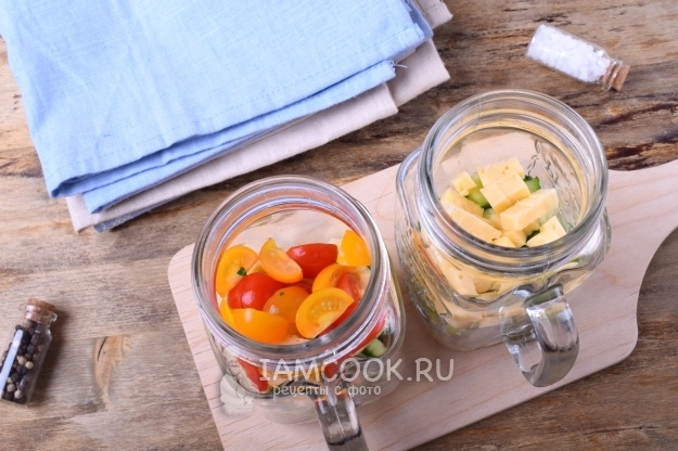 Следующий слой - сыр, затем нарезанные черри. Слои выкладываем, не утрамбовывая их.