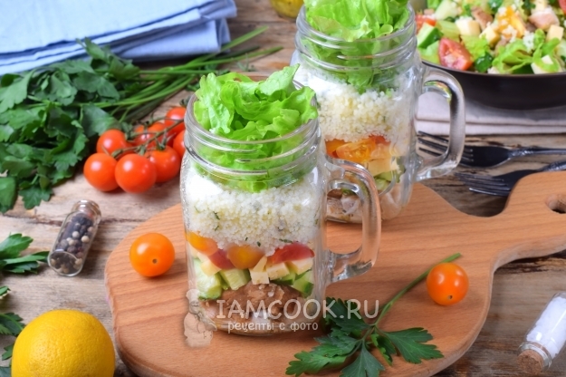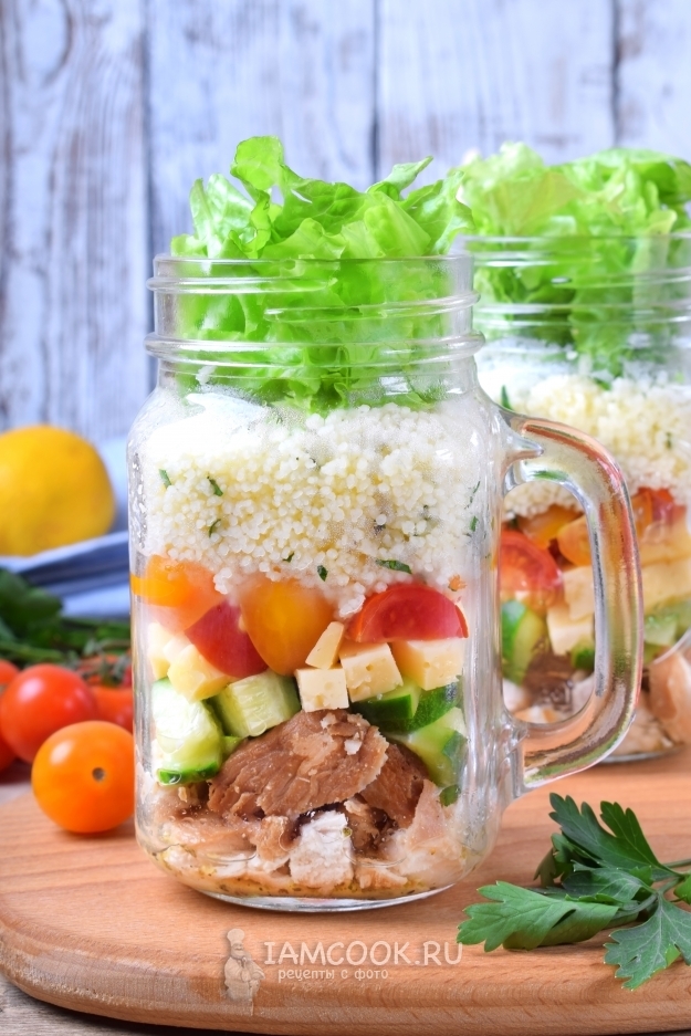 Приготовим слоеный сытный салат в банке с жареной курицей, кускусом и свежими овощами, а интересный вкус придаст греческая заправка.