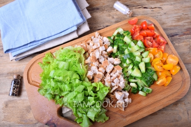 Остывшее куриное филе нарежем мелким кубиком, так же нарежем и огурец. Томаты черри разрежем на четвертинки, листья салата - тонкими полосками.