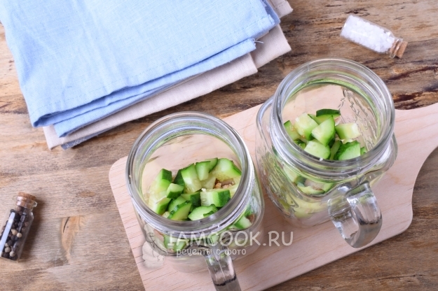 Все готово для того, чтобы компоновать салат. В каждую банку нальем заправку и начнем выкладывать слои.