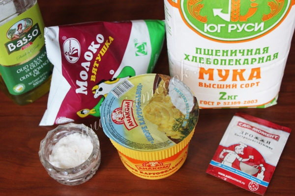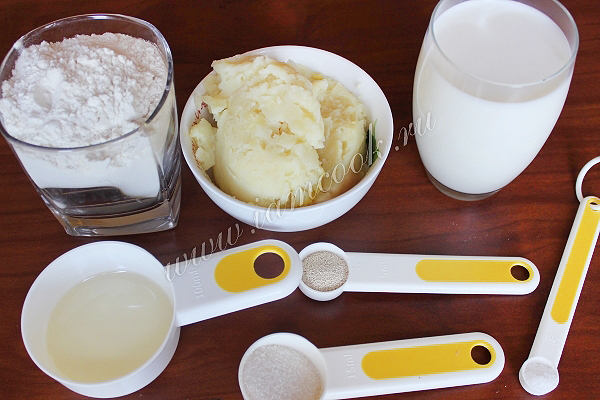 Подготовьте молоко, муку, растительное масло, соль, по желанию сахар, сухие дрожжи и обычное картофельное пюре