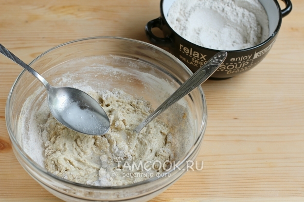 Затем начнем добавлять ржаную муку, сначала 1/3 часть муки, затем соду, гашенную уксусом, после - остальную муку, тщательно смешивая все вместе.