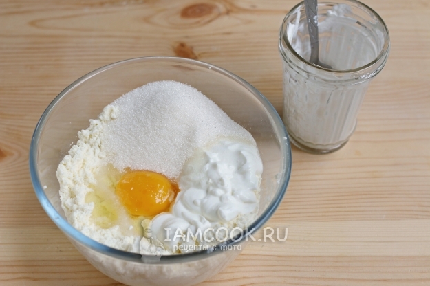 Сначала сделаем тесто. Соединим в миске 200 граммов сметаны, одну столовую ложку сахара, соль и одно яйцо.