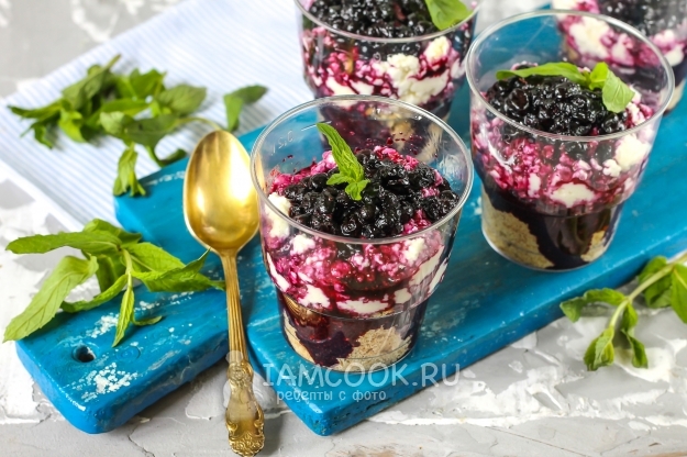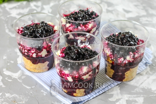 Залейте ягодной массой и поместите ленивый чизкейк с черникой в стаканах в холодильник на 1 час.