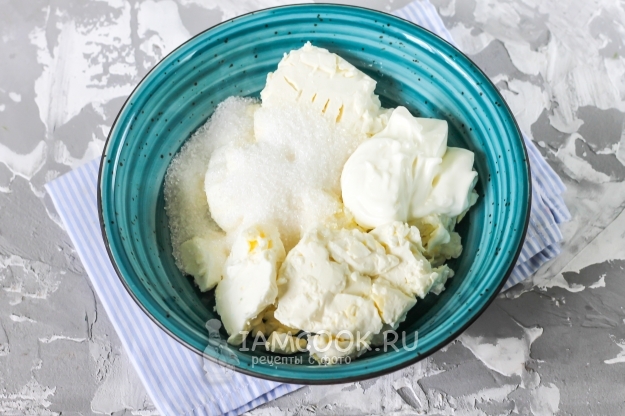 В миске или салатнике смешайте творог со сметаной и 2 ст.л. сахара.