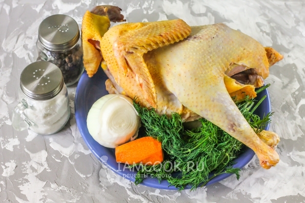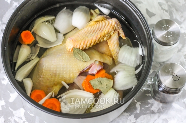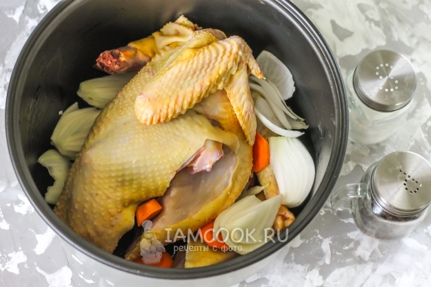 Домашнюю курицу промойте в воде снаружи и изнутри. Отрежьте окорочка и выложите птицу в чашу вместе с отрезанными частями. Куриная кожа при варке натягивается и ножки могут упереться в крышку и не дать ее закрыть, если захотите проверить в процессе варки блюдо. Очистите луковицу и морковь от кожуры, промойте в воде и нарежьте крупными ломтиками. Добавьте в чашу мультиварки.
