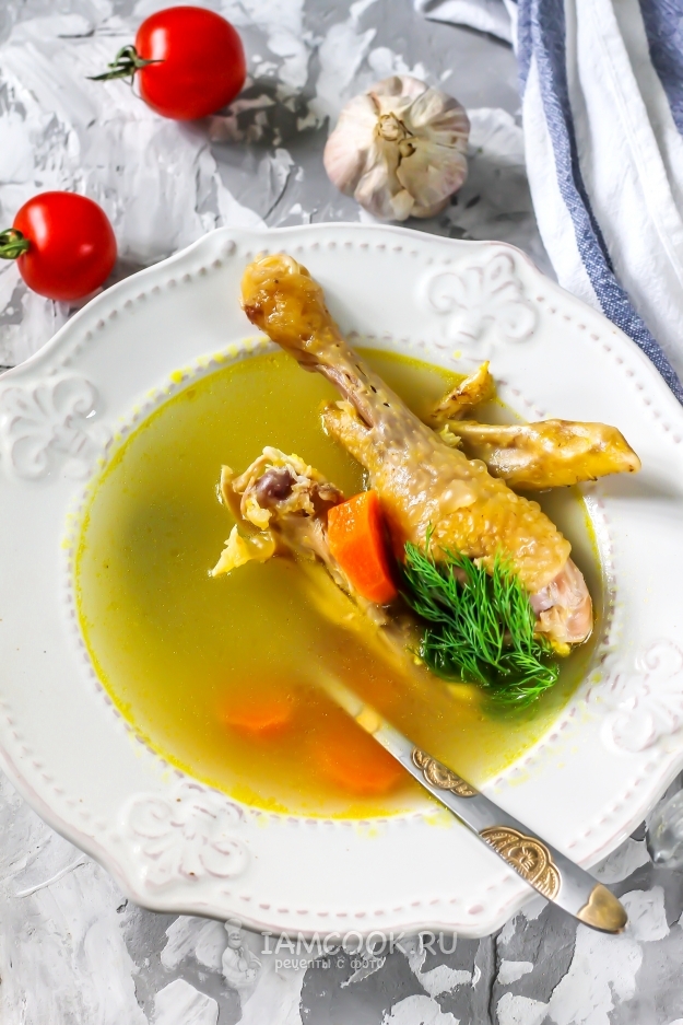 В глубокую тарелку выложите часть курицы, влейте пару половников наваристого бульона и подайте к столу с несладкой выпечкой, сухариками.