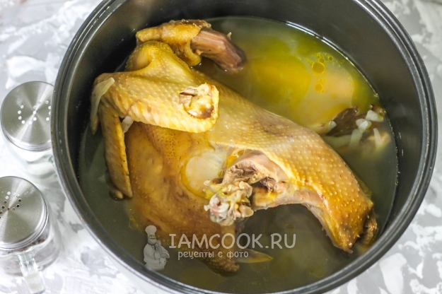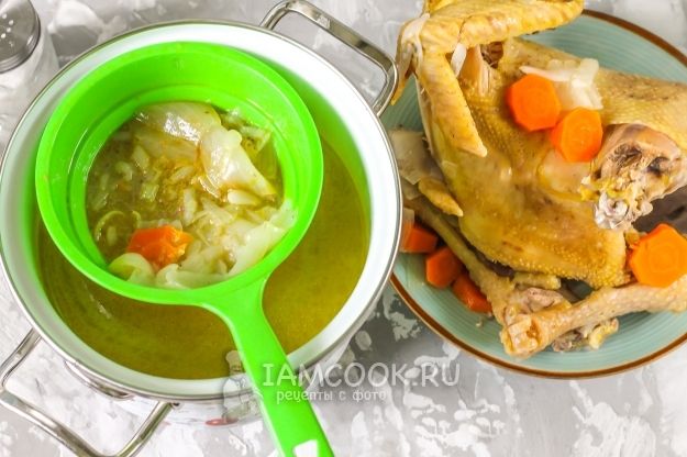 Извлеките курицу, окорочка и овощи на тарелку. Бульон процедите через ситечко в другую емкость.