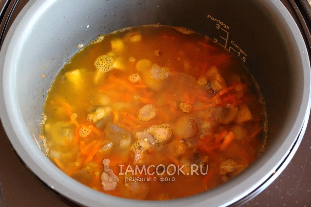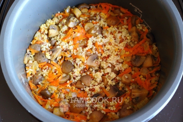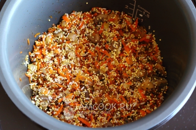 Затем вливаем воду, меняем режим на «Кашу» и готовим до сигнала мультиварки.