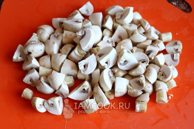 Шампиньоны промываем, очищаем, если грибы почернели, и нарезаем четвертинками, отдельно отрезая ножку.