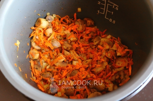 В чашу к грибам наливаем масло, перекладываем лук и морковь, всыпаем специи по вкусу: соль, перец, сушеную петрушку.