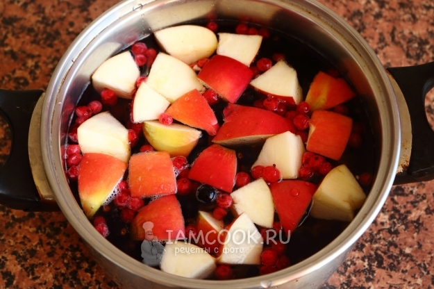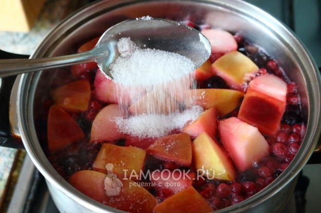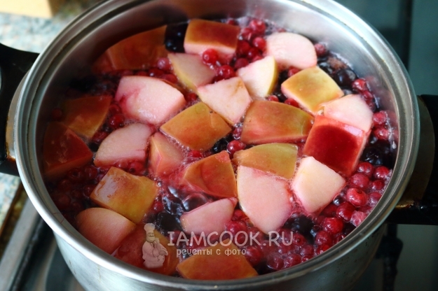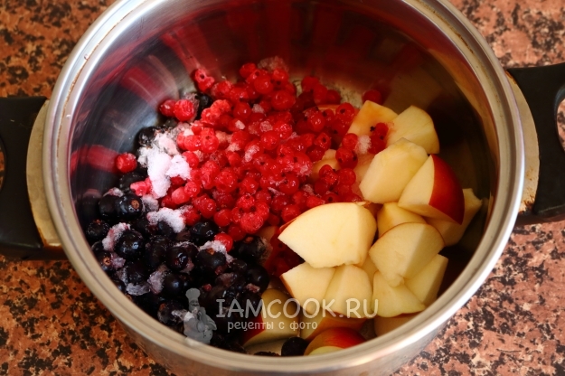 Выкладываем в кастрюлю вместе с замороженной красной и черной смородиной.