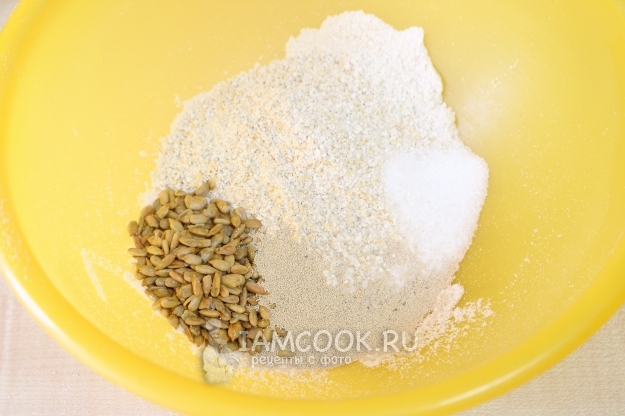 В миске соединяем следующие ингредиенты: овсяную муку, соль, сахар, дрожжи, ядра подсолнечника.
