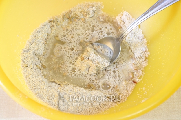 Перемешиваем до однородности и вливаем в центр теплую воду с разведенным в ней мёдом.