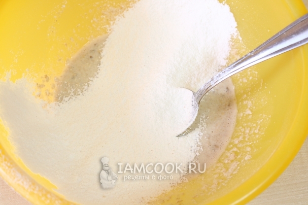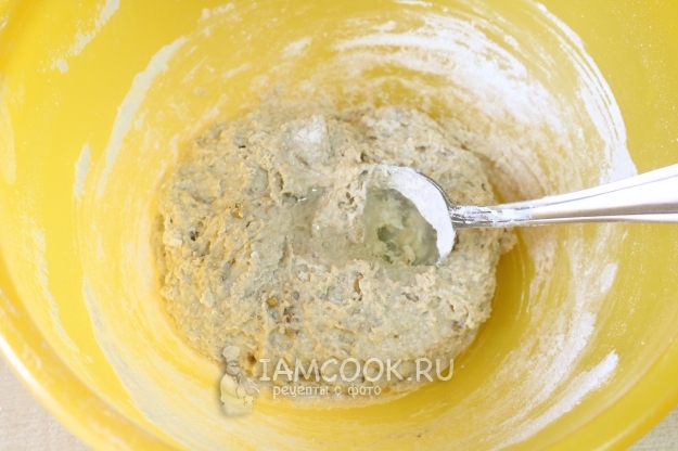 Снова мешаем. Следом просеиваем большую часть пшеничной муки (около 100 г), замешивая тесто ложкой.
